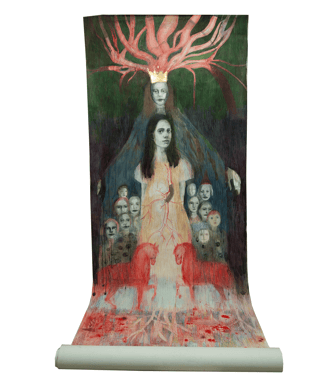 J’ai choisi le support idéal pour mes réalisations- papier enroulé. Le rouleau en lui-même symboliquement représente l’infinie. Je fais un appel aux spectateurs avec la première partie visible de continuer à dérouler.